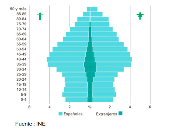 De esta pirámide, extraemos datos curiosos como por ejemplo que las personas mayores de 65 años representan el 18,7% de la población o que los extranjeros representan un 9,5%.